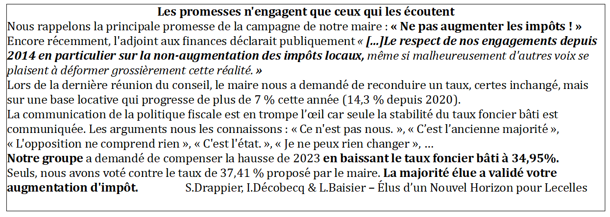 Nous rappelons la principale promesse de la campagne de notre maire : « Ne pas augmenter les impôts ! »