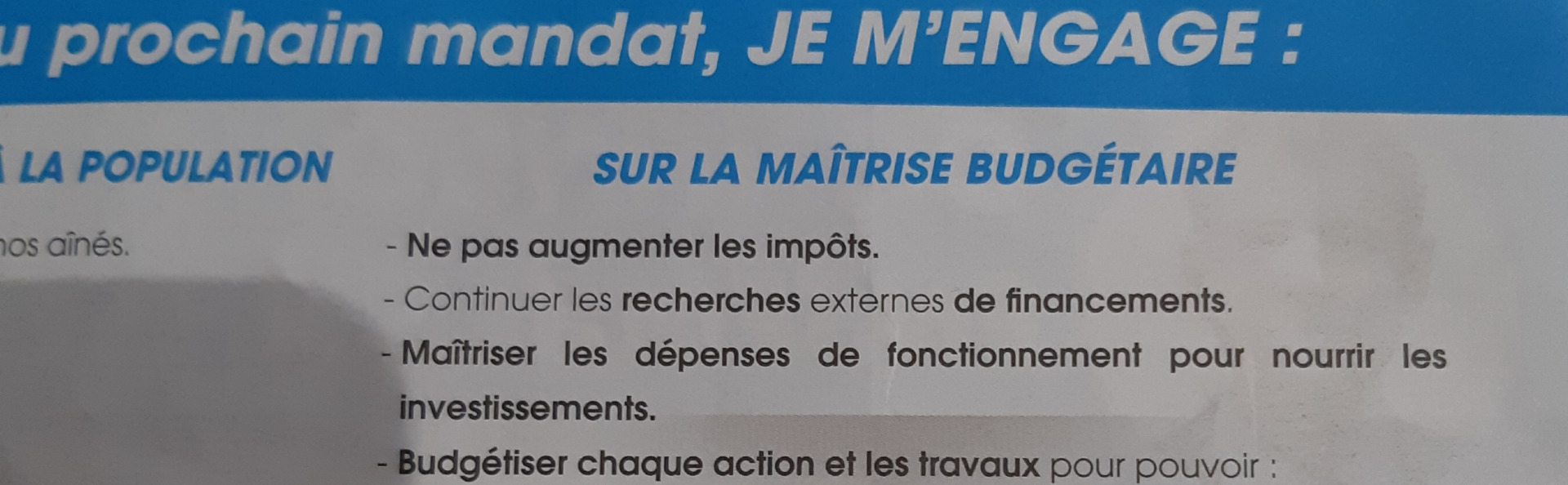 Encore récemment, l'adjoint aux finances déclarait publiquement « [...]Le respect de nos engagements depuis 2014 en particulier sur la non-augmentation des impôts locaux, même si malheureusement d'autres voix se plaisent à déformer grossièrement cette réalité. »