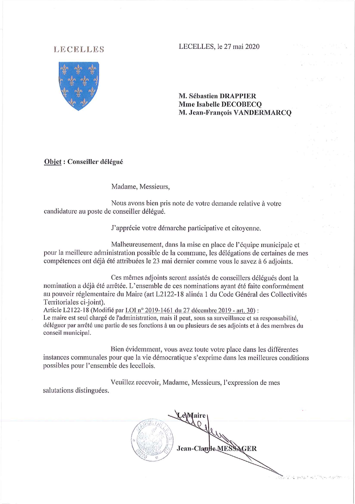 Le 26 mai 2020, nous avons demandé un poste de conseiller délégué.